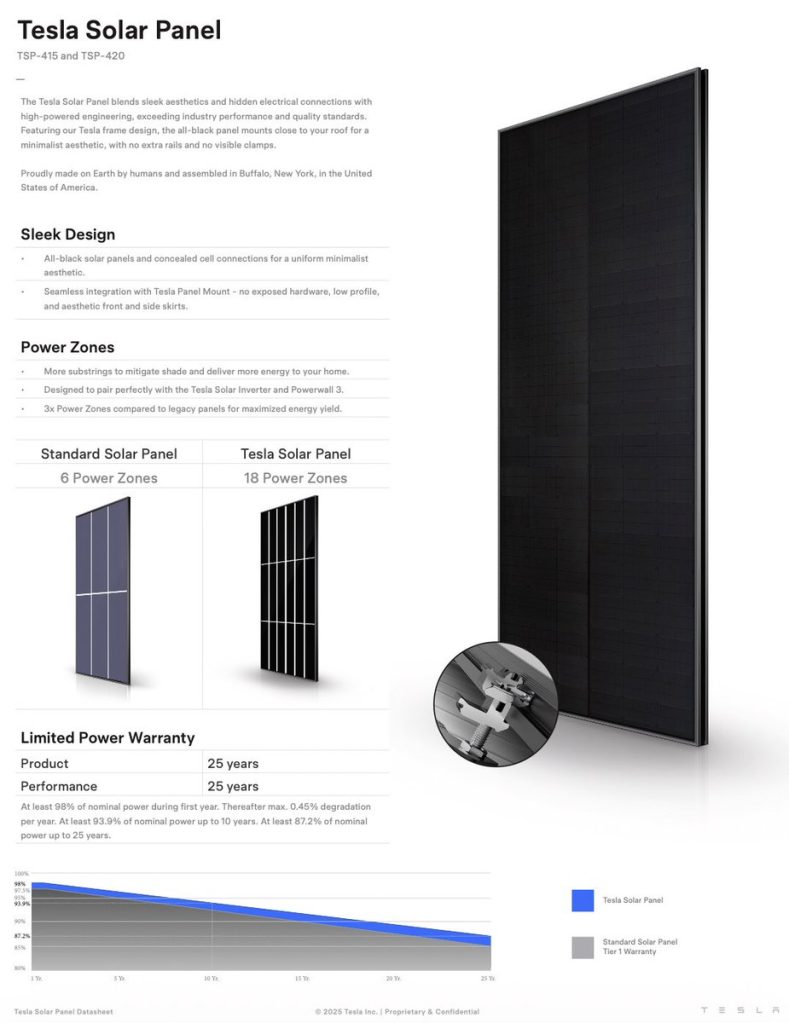 Технические характеристики показывают модули мощностью 415 Вт и 420 Вт, что является стандартом для текущего рынка; ранее мы сообщали, что Tesla перешла на панели мощностью 420 Вт еще в 2021 году.