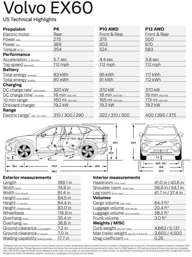 Ранее в этом месяце мы уже узнали некоторые характеристики EX60: Volvo объявила, что этот автомобиль станет ее самым быстро заряжающимся и самым дальним электромобилем на сегодняшний день. Автомобиль может получить до 173 миль запаса хода за 10 минут на зарядном устройстве мощностью 400 кВт и напряжением 800 В. В США это будет первый автомобиль Volvo, который по умолчанию будет оснащен зарядным портом NACS (другие электромобили Volvo могут использовать адаптер для зарядки на станциях NACS/Tesla Superchargers).