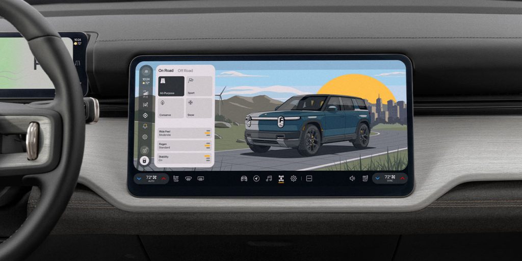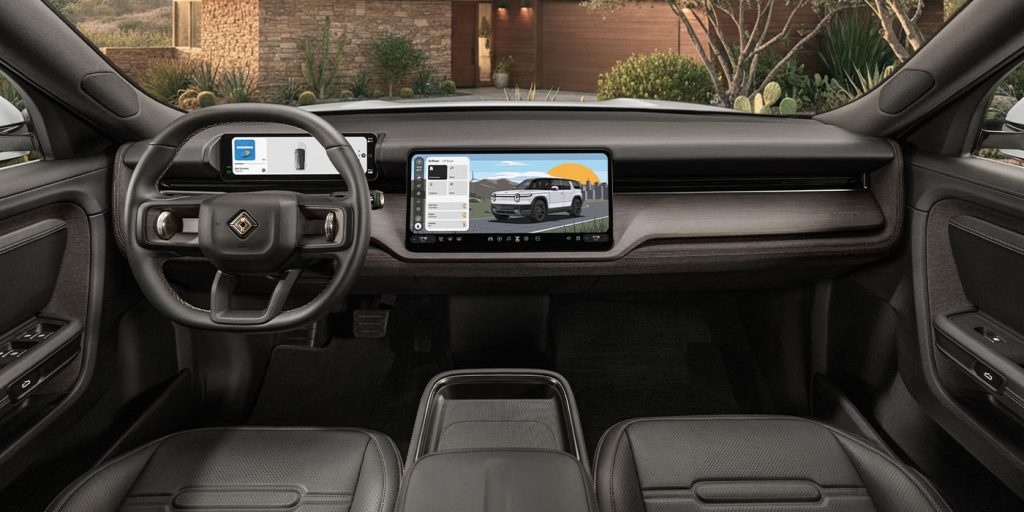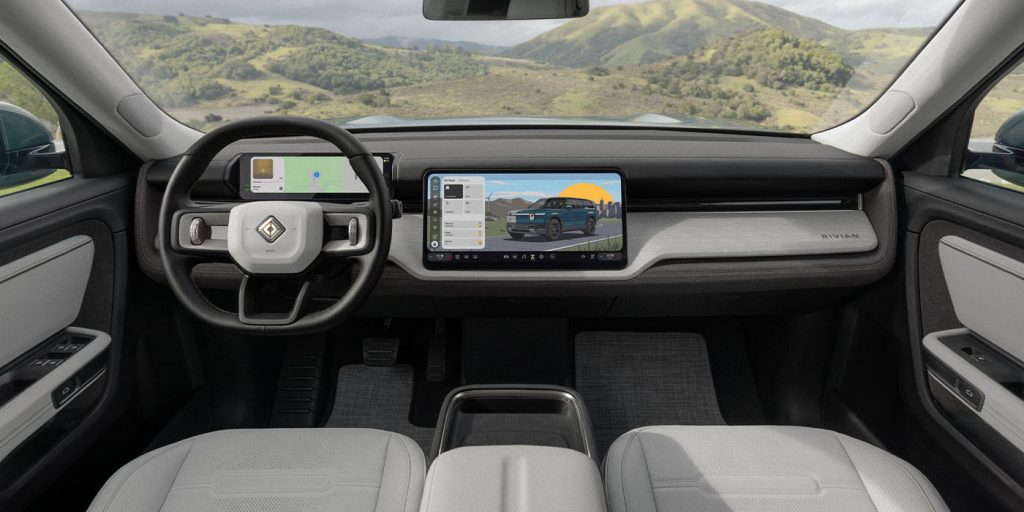 Хотя приборная панель R2 выглядит очень похоже на ее собратьев R1, Rivian внесла некоторые оптимизированные изменения, на которые мы хотели бы обратить внимание. Наиболее заметными, вероятно, являются новые тактильные «гало»-регуляторы Rivian на рулевом колесе. По данным Rivian:
